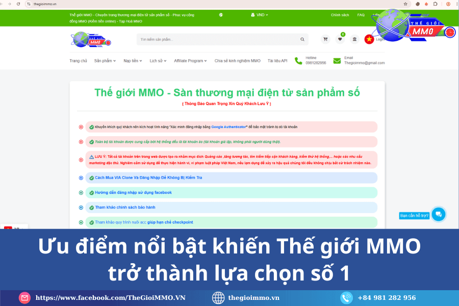 Thế giới MMO là một trong những hệ sinh thái kiếm tiền online phát triển nhanh nhất tại Việt Nam. Khi nhu cầu làm MMO ngày càng tăng, người mới luôn cần một nền tảng uy tín để mua nguyên liệu, học kiến thức và triển khai công việc. Thế giới MMO đáp ứng trọn vẹn các nhu cầu đó nhờ mô hình “all-in-one” giúp người làm MMO tiết kiệm thời gian, tối ưu hiệu suất và giảm rủi ro khi bắt đầu.
